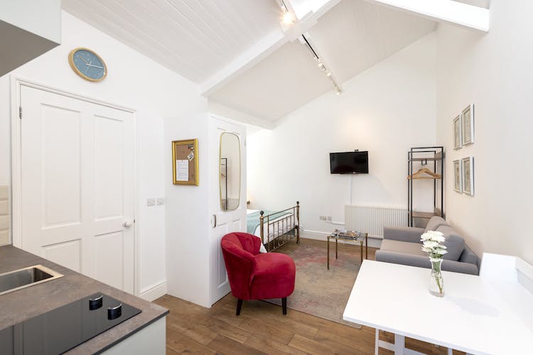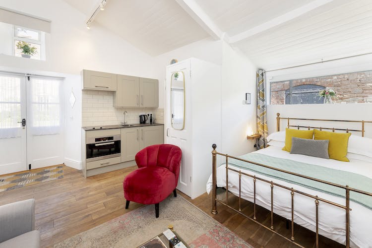 The Nook is a cosy studio apartment across the courtyard in our beautiful converted barn. This comfortable open plan space has a double bed, a small well equipped kitchen, ensuite shower-room and seating area with smart TV and complimentary wifi. The Nook has its own front door so can come and go at your leisure.
